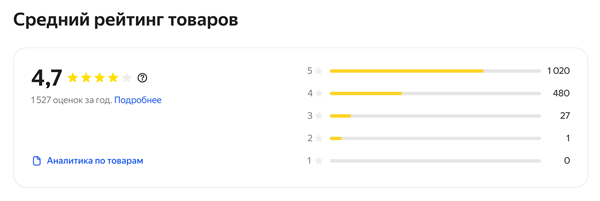 В кабинете он отображается как Средний рейтинг товаров. Посмотреть можно на странице магазина на Маркете и на карточках товаров. У покупателей на Маркете есть возможность фильтровать результаты поиска и видеть товары только от магазинов с самым высоким рейтингом. Если товар предлагает несколько продавцов, высокий средний рейтинг товаров может убедить покупателя выбрать именно его, даже если цена в нем выше.
