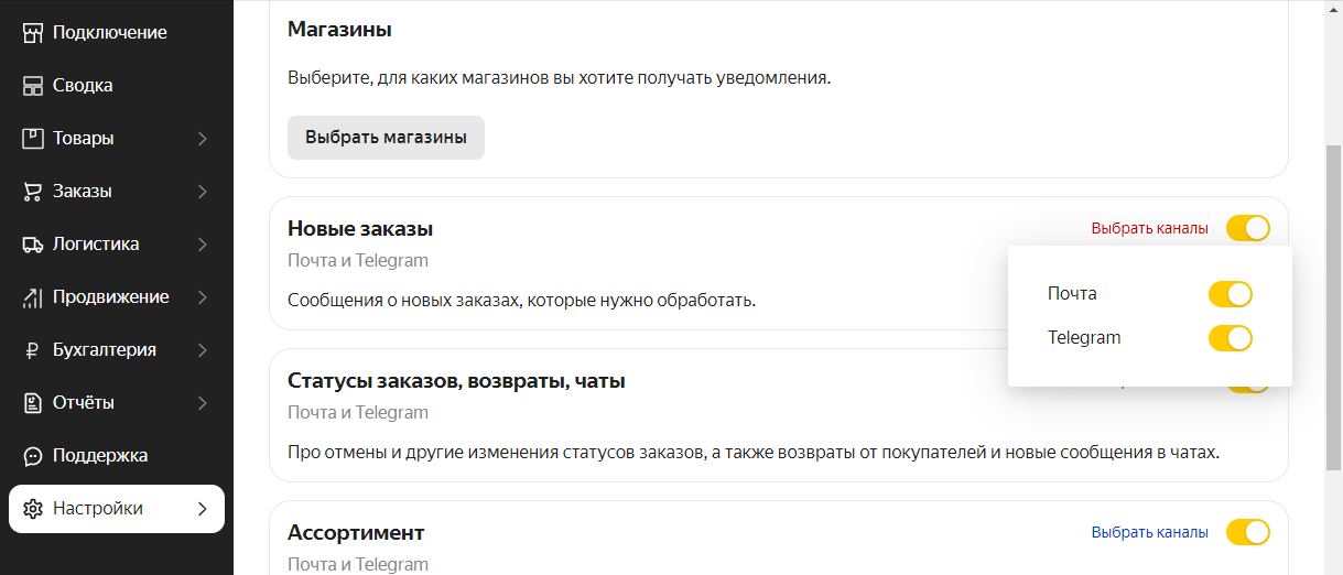 - 要禁用不必要的通知类型,请单击通知名称旁边的单选按钮。 如果您希望仅通过电子邮件或仅在Telegram中接收通知,请单击 选择频道 并留下所需的方法。