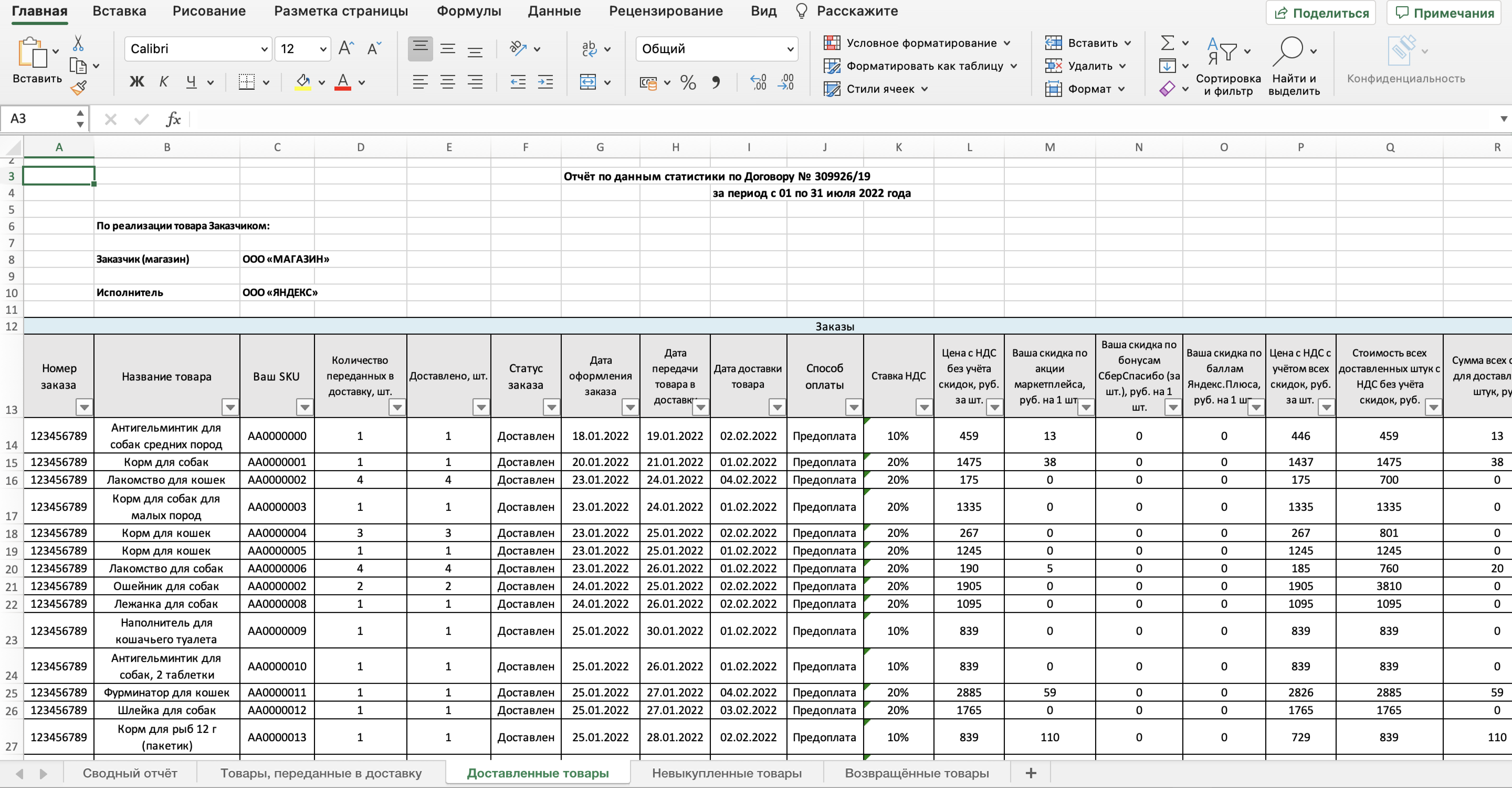 Отчет показывает, сколько ваших товаров и на какую сумму передали в доставку, доставили покупателям, не выкупили и вернули за месяц. На отдельных листах вы найдете списки этих товаров.