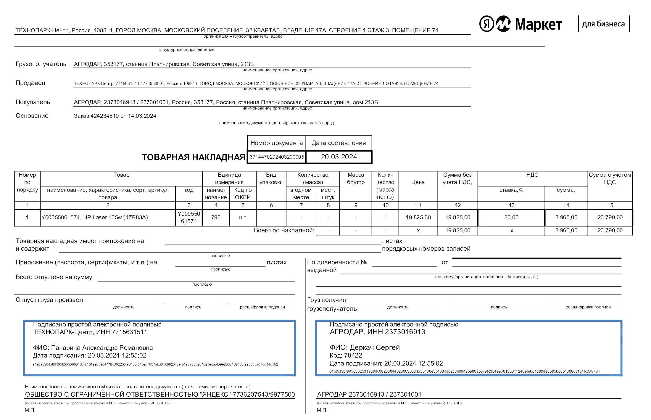Согласно п. 5 ст. 9 закона "О бухгалтерском учете" от 06.12.2011 N 402-ФЗ, ст. 9 закона "Об электронной подписи" от 06.04.2011 N 63-ФЗ, а также Правилам использования сервиса «Яндекс Маркет», п. 8.5.2 Условий размещения Товарных предложений на Маркетплейсе Яндекс Маркет для бизнеса (модель FBY), п. 9.5.2. Условий размещения Товарных предложений на Маркетплейсе Яндекс Маркет для бизнеса (модель FBS).