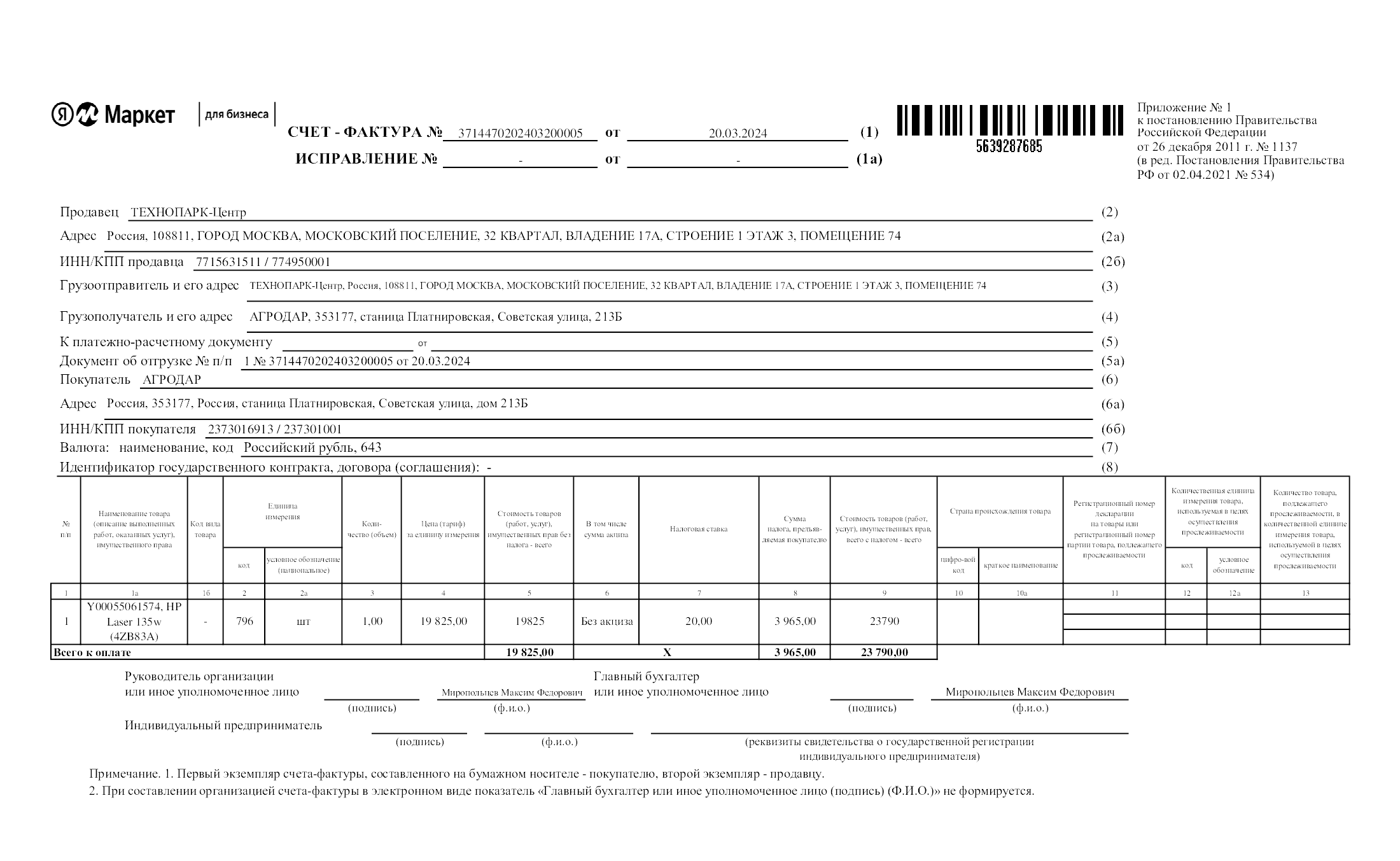 Корректировочный счет-фактура (если покупатель вернул заказ) подписывается, когда Маркет принял возвращенные товары на своем складе, и тоже в бумажном виде отправляется почтой.