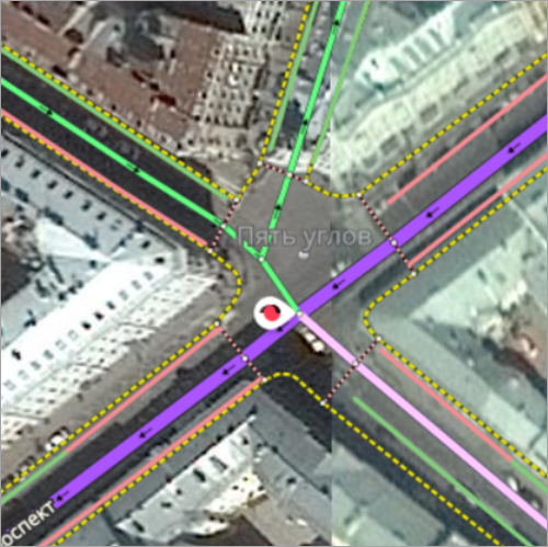 Intersections and at-grade junctions are represented as a placemark with no polygons on the map. For example,