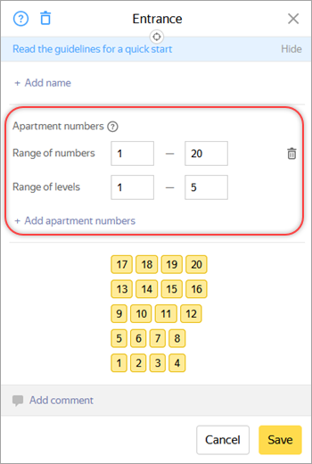 - To set the range of apartment numbers, specify the first and the last of the consecutive apartment numbers of the entrance, provided that they are numbered sequentially (without omissions) and are located on the same floor or on several floors in a row with an equal number of apartments on each floor.