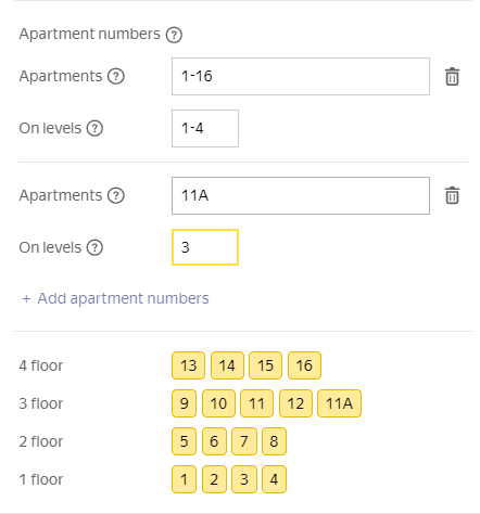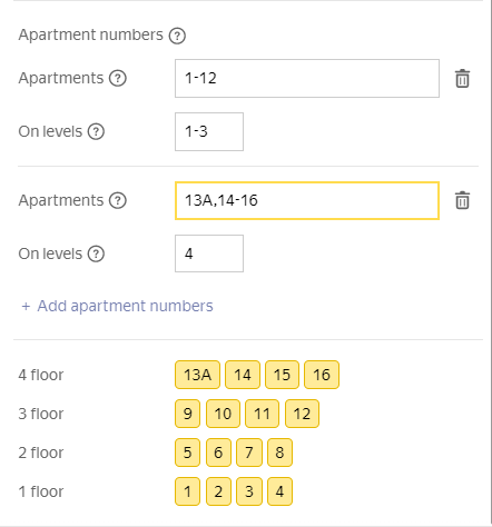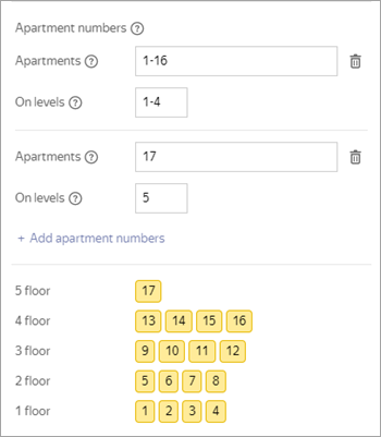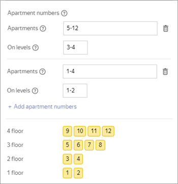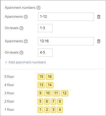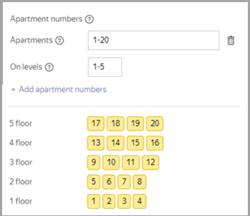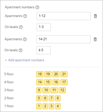 If the sequential numbering condition is not met (the sequence of apartment numbers is broken or the number of apartments is different on different floors), set several combinations of apartment number and floor ranges so that this condition is met for each range. To add a second and subsequent range combinations, click Add apartment numbers again:
