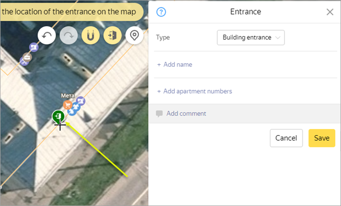 Techniques for drawing and editing entrances to buildings are similar to the techniques for drawing and editing all places on the YME. See: