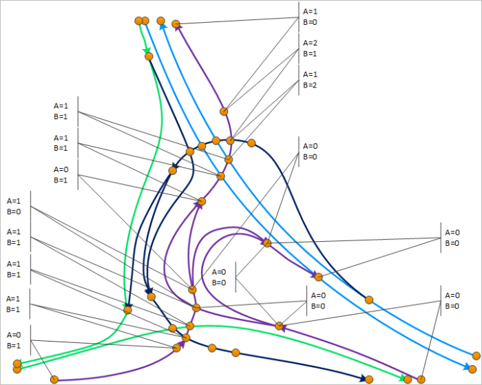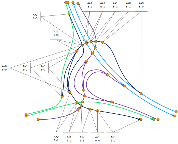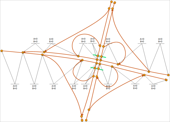 Figure 7. Road network map. The small brown circles depict road intersections (the circles at the edges of the drawing do not correspond to actual intersections in the road network, they are just there to define the scope of the diagram). Arrows correspond to road sections. The arrows indicate the traffic direction and the drawing direction (A → B). The green lines indicate the road sections that pass over bridges and overpasses