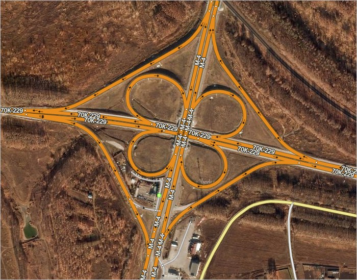 Figure 4. Mapping levels A and B of P-140 and M-4 exit ramps (the brown circles represent road intersections); all levels equal zero