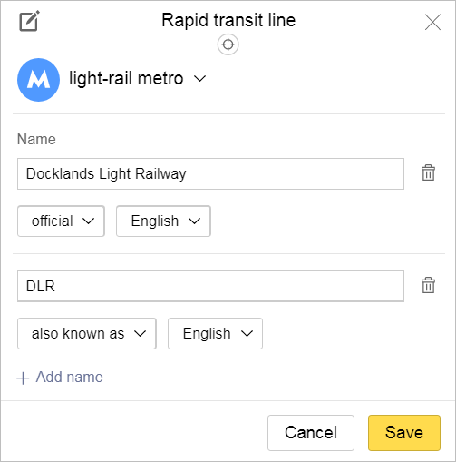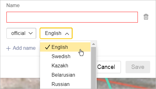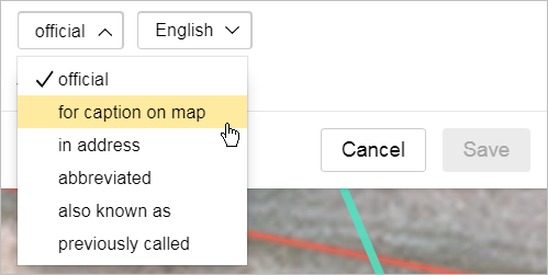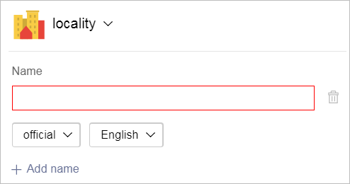 Click on the first field and select the type of name from the drop-down list (official, for map caption, etc.). For a description of name types, see Section 3.1.3.1. Name types: general rules: