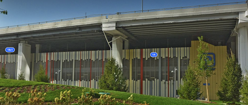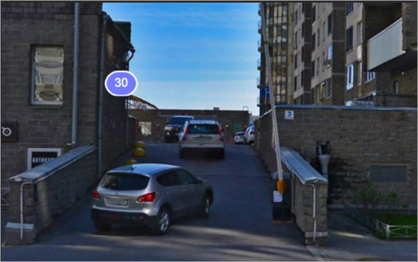 The building is under a structure on which the road is located (for example, the building is under a bridge, elevated pedestrian crossing, and so on).