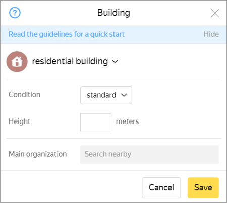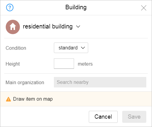 Height displays on the map for all buildings and structures; enter a whole number for the height in meters with no additional characters or comments. The number of characters in the field can not be more than three.