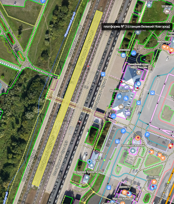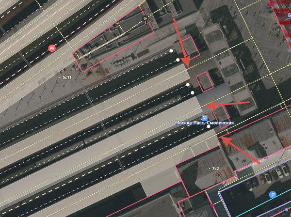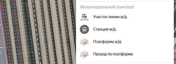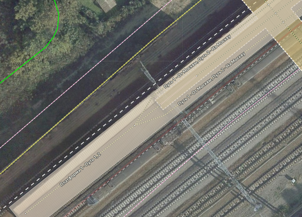 Platform walkways in Yandex Map Editor are composite lines that are not drawn on the map, but rather compiled from one or more road sections, each drawn individually and assigned attributes separately (for more information, see 3.3.2. Attribution rules of sections).