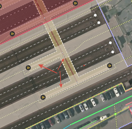 The red arrows below show which road sections you shouldn't include in the item, because the pedestrian crossing with stairs leads to other platforms.