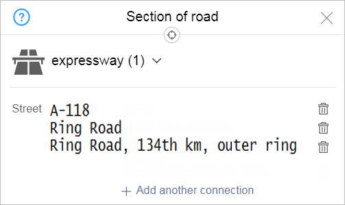 Roads are created as individual items when you fill in the Street field in the attribute panel for a road section. For more information, see 3.3.2.2. Street). After you create the road, its name will appear as a link in the attribute panel for that road section.