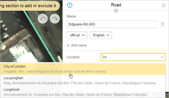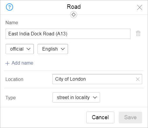 The Location attribute determines how roads are linked to an administrative division or vegetation item (if they aren't in the list of official streets of a locality and are named by the administration of the vegetation item). Unless otherwise specified in the rules for a particular road type or country, link a road to level 4 (or higher) administrative division that fully covers it.