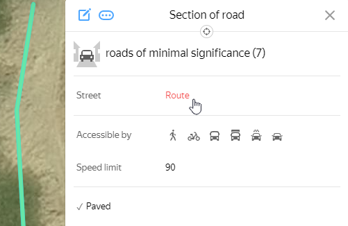Roads in Yandex Map Editor are composite linear items that are not drawn on the map, but rather compiled from one or more road sections, each of which is drawn individually and assigned attributes separately. For more information, see 3.3.2. Attribution rules of sections).