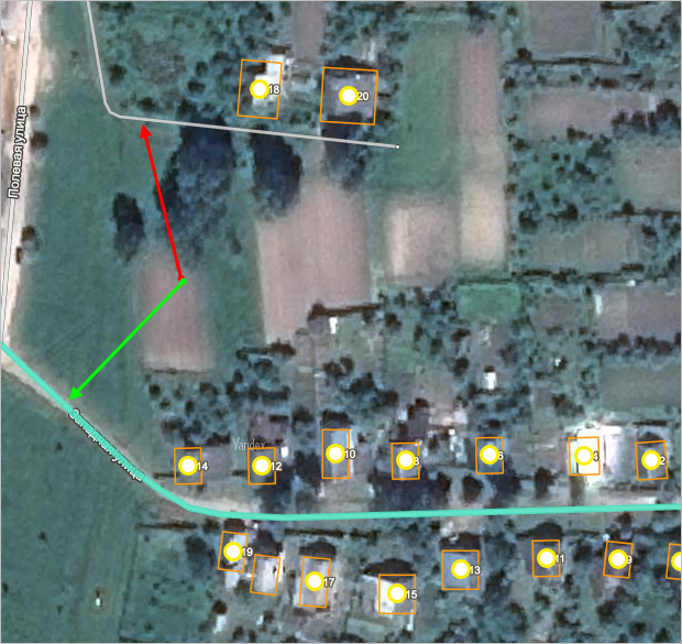 The green arrow on the drawing points to a named section of a street and the red arrow — an unnamed section of the same street:
