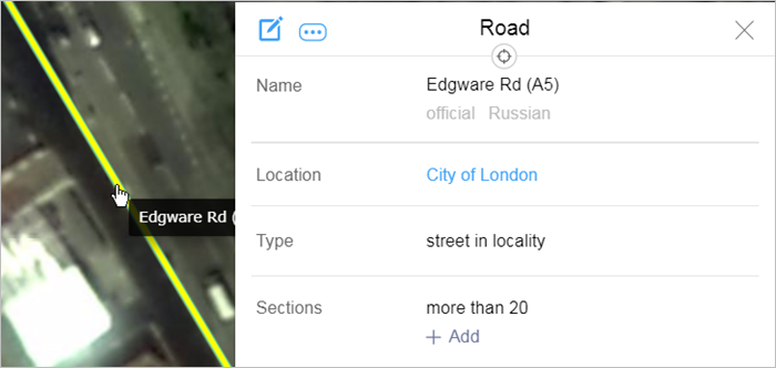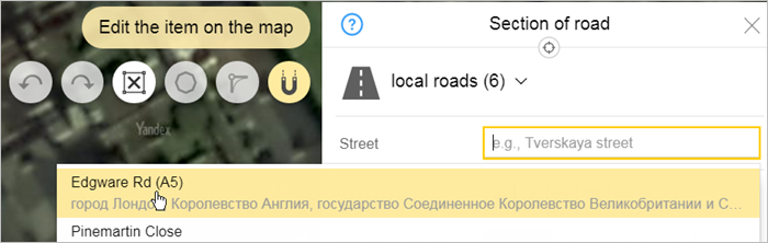 Depending on the specific item, the editing panel will include different attributes. For example, for rapid transit lines, only names can be edited; for railways — names and types. For motorways, you can edit names, types, and locations (linking the road to the administrative division where it is located):