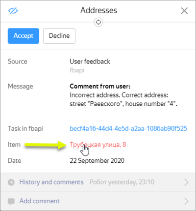 - The report covers a missing address that's already been added to the map, while the inaccuracy is located inside or near the building with the address specified in the report, or in the corresponding residential area sector.