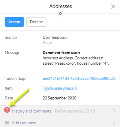 Click the selected icon. The report point will be highlighted on the map and its inaccuracy management card will open (the same goes for suggestions):