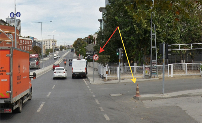 For example, in the picture below, the red arrow marks a sign prohibiting a right turn, and the yellow arrow points to the road onto which the turn is prohibited by that sign.