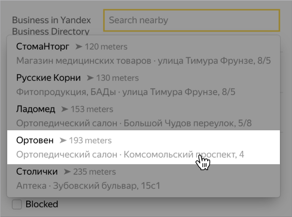 field. If the organization already has an entry in Yandex Business, it will show up in the list. Choose the corresponding line from the list to have the organization's information linked to the map: