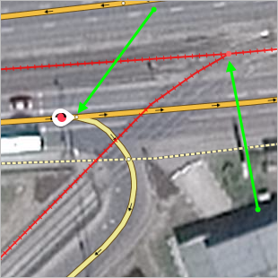 .The intersection along with all the road sections that relate to it will switch to editing mode. Drag the intersection to the appropriate place (the vertexes of the line sections that form that intersection will change their configuration when you do this) and edit the sections of road if necessary: