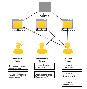 Один пользователь может иметь доступ к нескольким магазинам, а в них — различные роли.