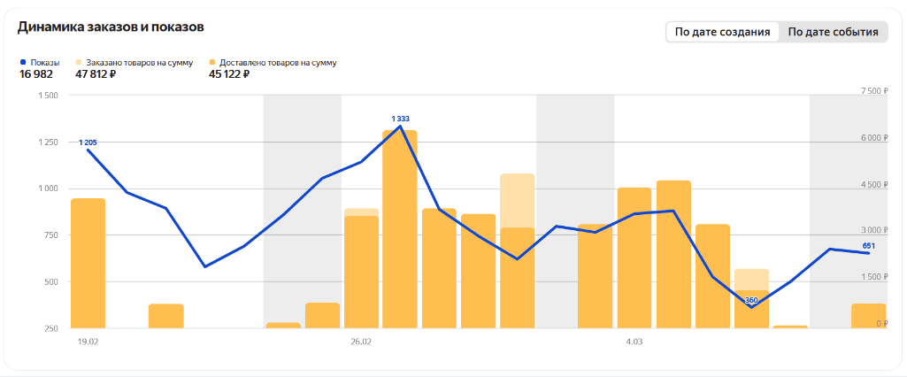График Динамика заказов и показов отражает, как менялось количество показов ваших товаров, а так же суммы заказанных и доставленных товаров. С его помощью можно проверить: