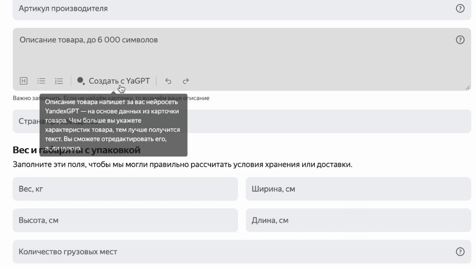 Нейросеть опирается на данные о товаре, которые вы передали Маркету. Чем больше характеристик вы укажете, тем качественнее получится описание. Если у товара уже есть описание — YandexGPT подготовит новое на его основе. Так можно быстро улучшить составленное вами описание.