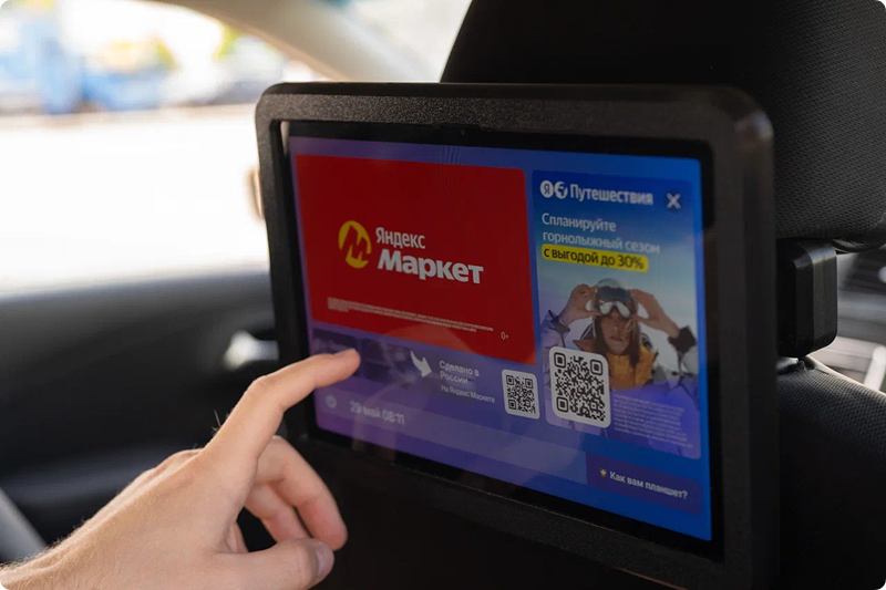 Вы можете настроить видеобаннер, который будет показываться пассажирам такси на специальных встроенных планшетах. Этот формат уже доступен в Москве, и количество автомобилей с планшетами постоянно увеличивается.