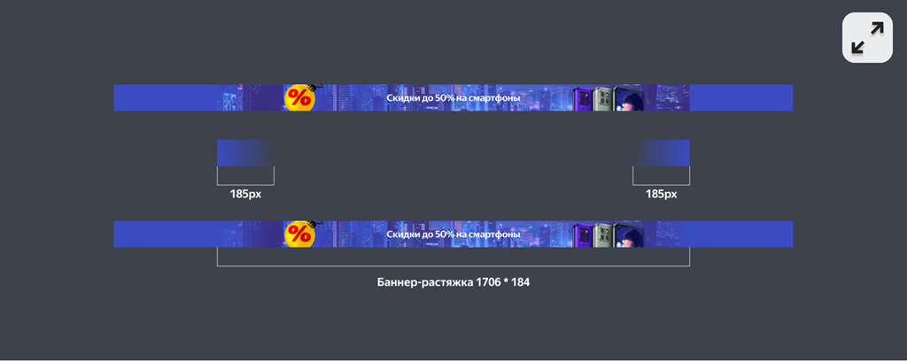 Размер 1706 × 184. Требования к фону: однородный цвет всего баннера либо одинаковый однородный цвет у правого и левого края. Чтобы фон по краям получился однородный, добавьте градиент.