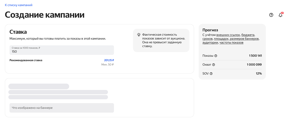 Задайте ставку — максимальную цену за 1000 показов. Если у Маркета достаточно данных, он может подсказывать вам конкурентную ставку — значение, которое повысит вероятность, что на странице будет показываться именно ваш баннер. Фактически заплатить за размещение нужно будет меньше — ставку ближайшего конкурента плюс 0,01 ₽.