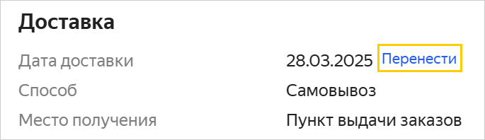 Вы можете перенести дату доставки на срок от 1 до 14 дней – и не более трех раз. Чтобы это сделать, на странице заказа выберите Детали → Доставка и нажмите Перенести.
