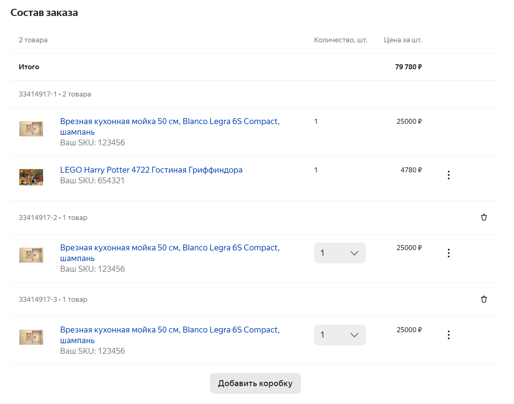 Обратите внимание: каждая единица товара может числиться только в одной коробке. Если товар едет в нескольких коробках, при распределении поместите его в одну из них.