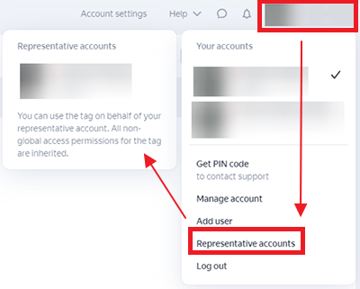 To switch to a representative account, select the login in the upper-right corner of the page and click Representative accounts.