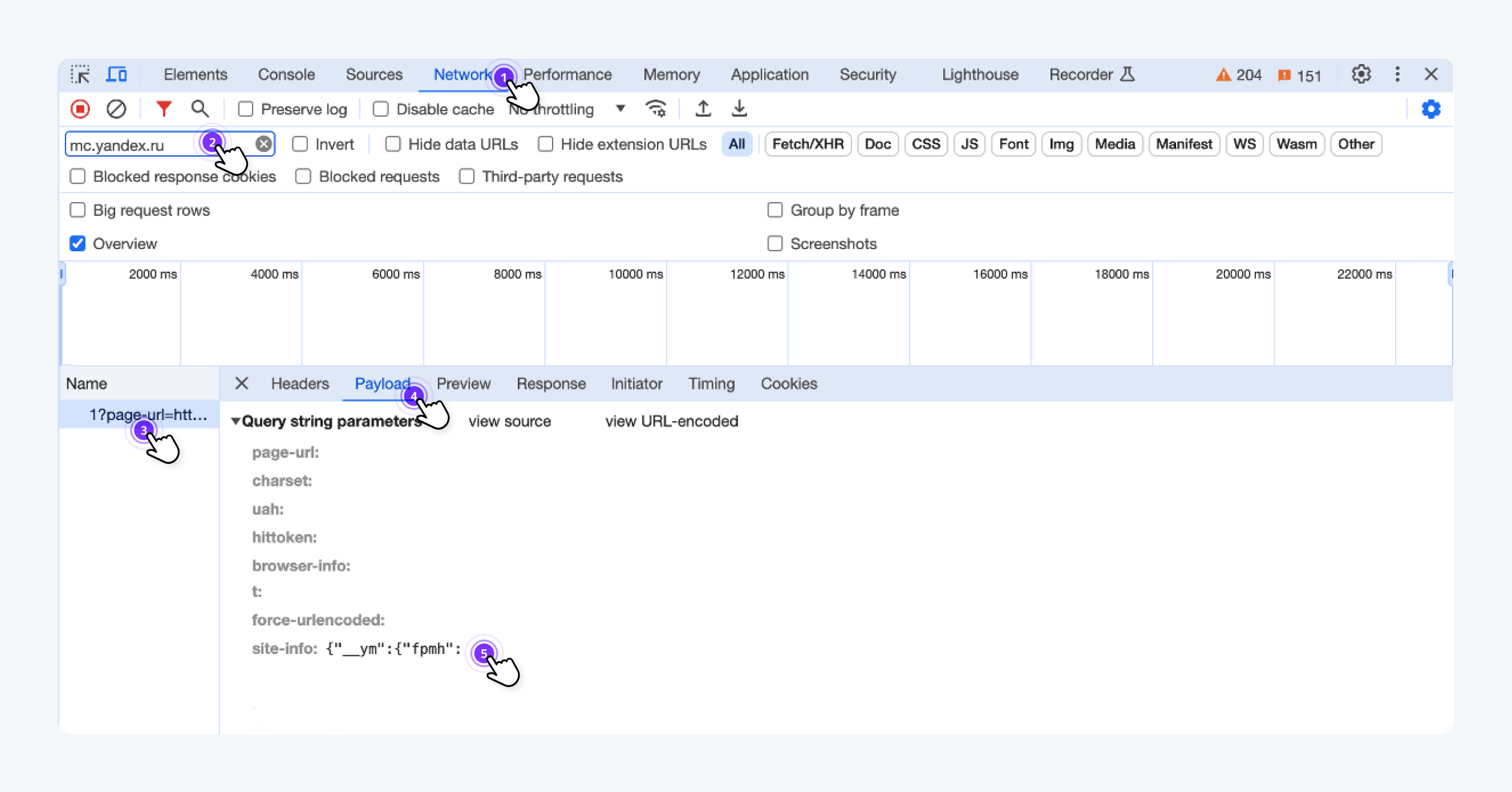 site-info: {“___ym”:{“fpp” …}parameter is present in the tab content, it means that you have found the correct request and data transfer is set up correctly. - If such a parameter is not present, open another request that starts with
