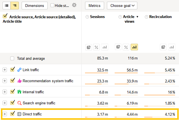 For example, a user clicked through to an article from search results, viewed it, moved on to another article, then returned to the previous one. As a result, Yandex Metrica records one pageview of one material, two pageviews of the other, and two sources: a transition from the search engine and an internal click-through.