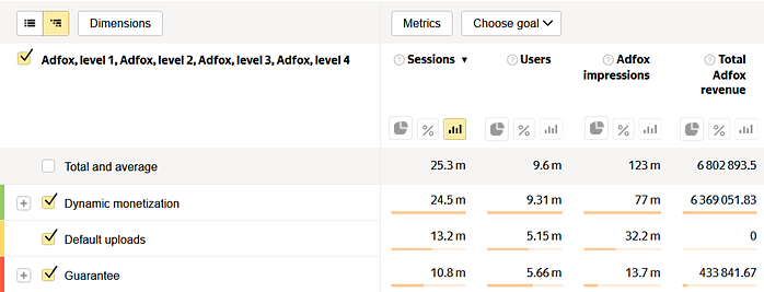 Adfox, level 1: Monetization type (guarantee, dynamic monetization, promo, or default uploads).
