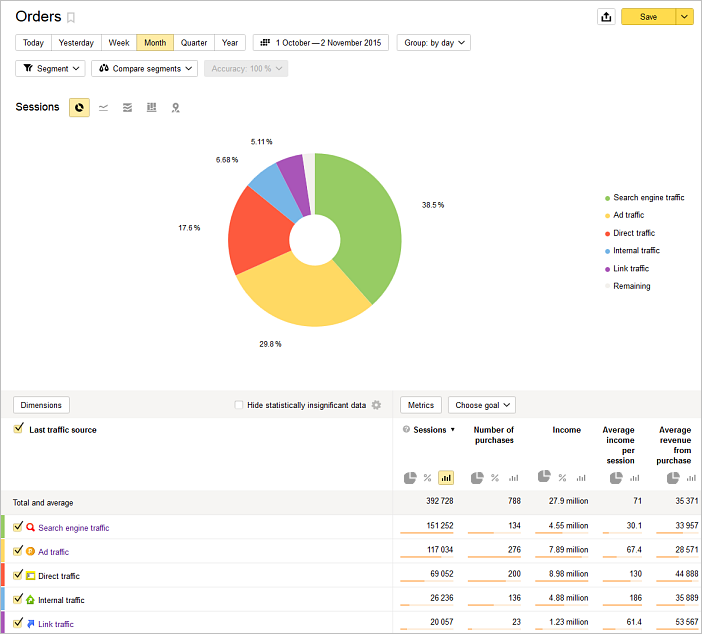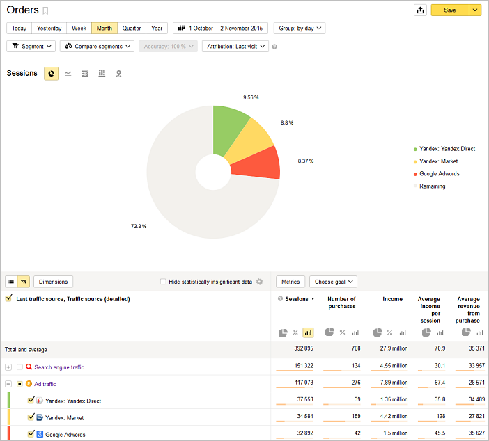 Data in the report is grouped by traffic sources. If you transfer data in multiple currencies, you can select one of them in the report. When you select a currency, monetary metric values are recalculated using the exchange rate from the day before the date of the transaction.
