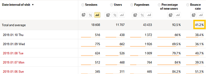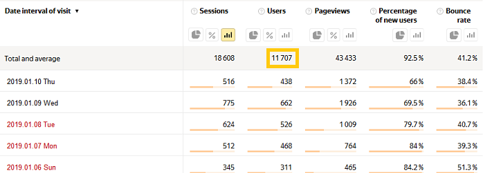 This report reflects your site’s traffic dynamics for a specified period. In addition to quantitative criteria (such as the number of users and pageviews), the report includes quality indicators (time on site, page depth, and so on).
