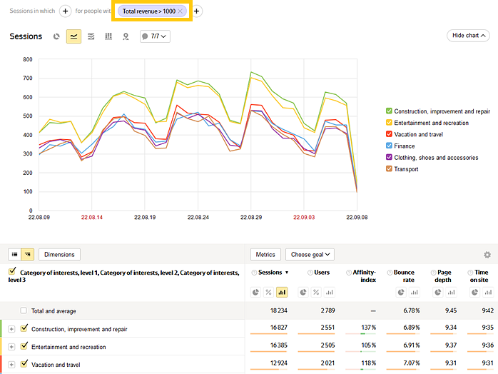 This report shows how much one topic or another is interesting to your site’s users, and also lets you analyze users’ behavior on the site depending on their interests.