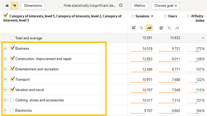 By comparing the affinity index to other indicators in the report (sessions, bounces, and conversion rate), you can determine the preferences of users who have the highest conversion rate.