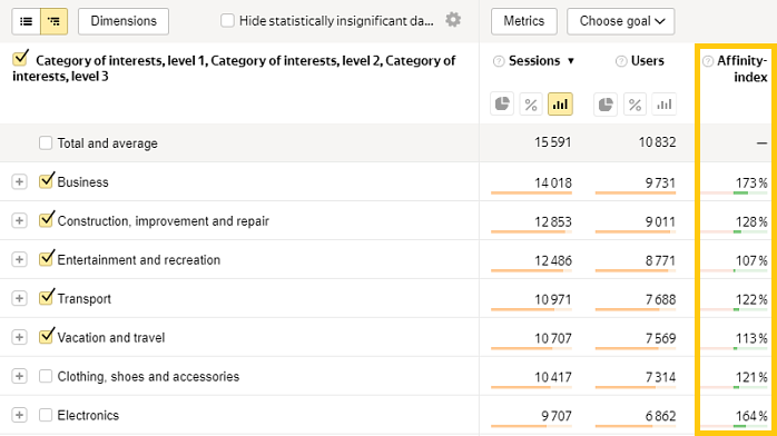 - If, on the contrary, the affinity index significantly exceeds 100%, the topic may be attractive to your audience. For example, an index of 200% for cars means that your site’s users are interested in the topic of cars twice as much as average internet users.