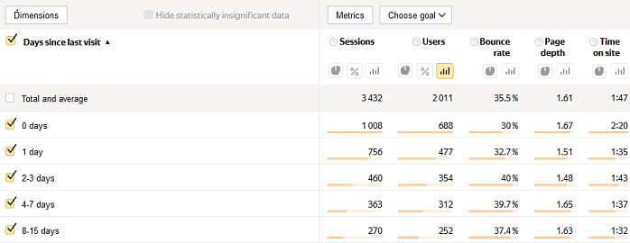 This report shows how often users return to your website. This can be useful for analyzing websites with frequently updated content, such as news websites. The report only includes users who were on the site during the selected period and had at least two sessions since the tag was installed on the site.