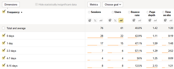 The report contains information about how often visitors return to your website. For example, the value “0” means they go to your website more often than once a day.