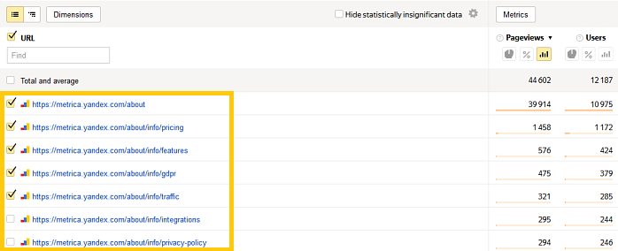 Un ejemplo de este informe está disponible para la etiqueta de demostración de Yandex Metrica.