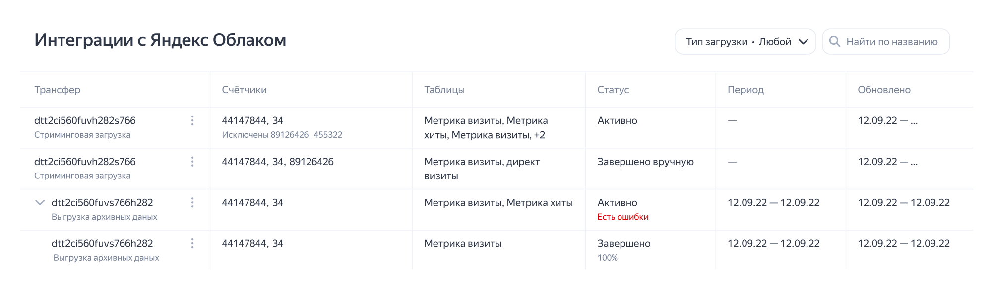 En la página Integración en la nube, puede ver usted sus exportaciones de los dos tipos siguientes: cargas en streaming y exportaciones de datos archivados. En el caso de las exportaciones de datos archivados, se muestra el porcentaje de finalización de cada tabla. La exportación de datos archivados durante un periodo prolongado puede tardar varios días o más.