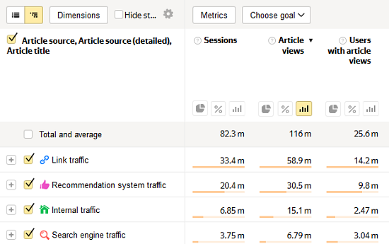 Por ejemplo, un usuario hizo clic en un artículo desde los resultados de búsqueda, lo vio, pasó a otro artículo y luego regresó al anterior. Como resultado, Yandex Metrica registra una vista de página de un material, dos vistas de página del otro y dos fuentes: una transición desde el motor de búsqueda y un clic interno.