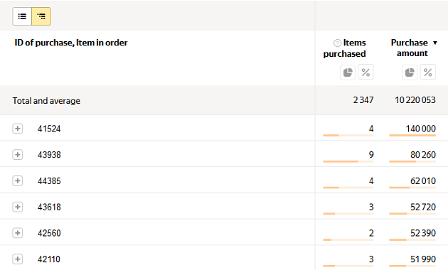 Este informe contiene información detallada sobre los pedidos realizados desde el sitio web y los artículos incluidos en un pedido individual: la cantidad de artículos por pedido, el costo por pedido y el costo total de todos los pedidos realizados durante el período seleccionado.