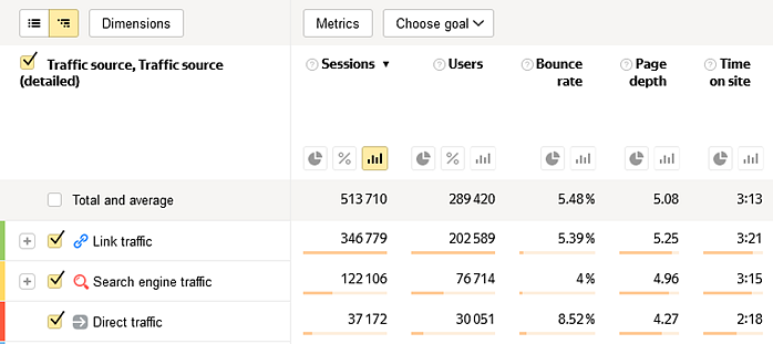 Cada sesión tiene su propia fuente. Yandex Metrica organiza las fuentes en grupos. Para más información, consulte Cómo Yandex Metrica detecta la fuente de tráfico.